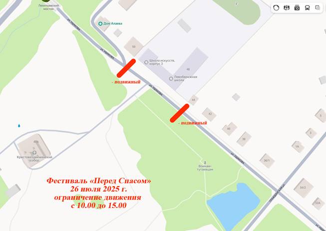 1. Временно ограничить в г.Тутаеве (левый берег) 26 июля 2025 года с 10.00 часов до 15.00 часов движение транспортных средств по маршруту: ул. Ушакова от дома № 44 до дома № 50 на территорию проведения фестиваля колокольных звонов «Перед Спасом»по периметру грузовыми или большегрузными автомобилями и установками временных дорожных знаков 3.2 (движение запрещено).