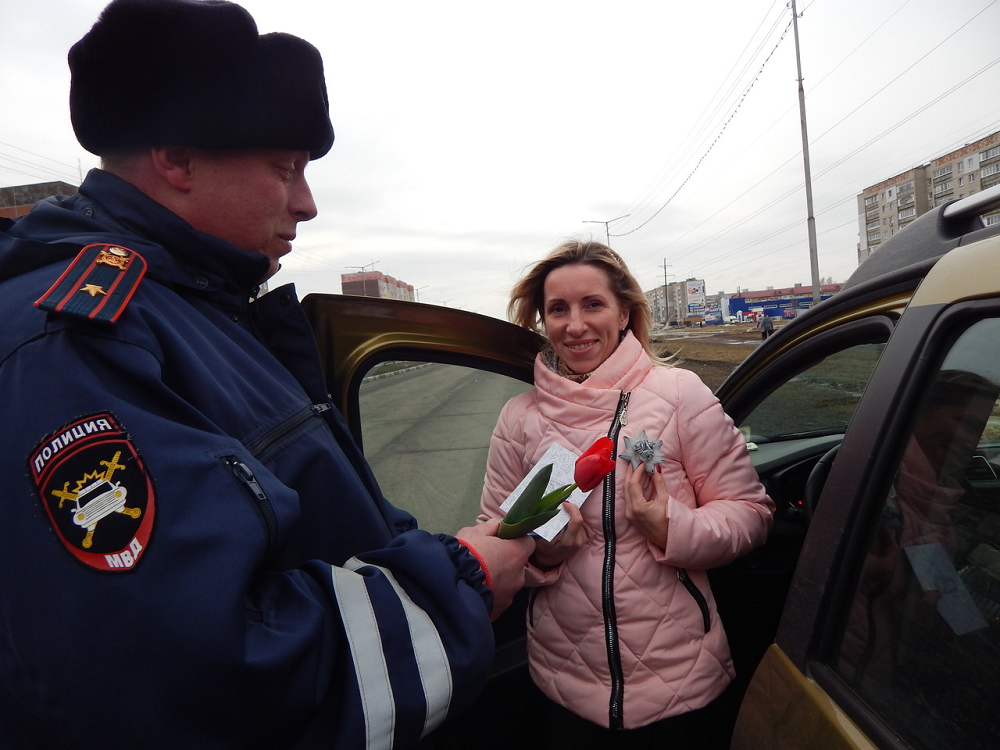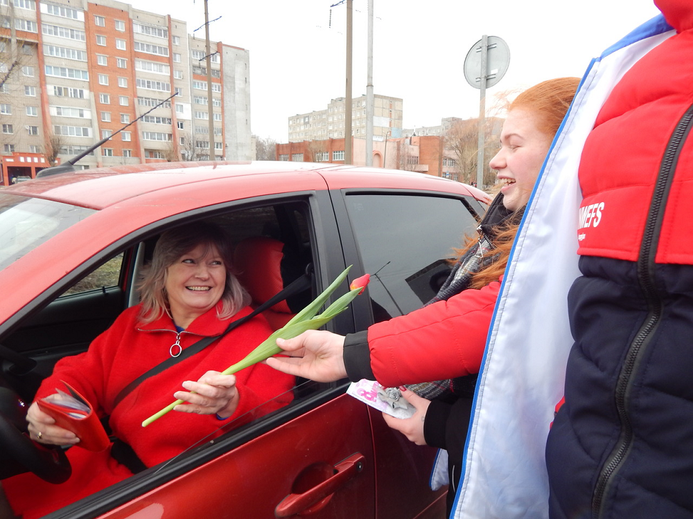 8 марта!В Тутаеве в преддверии Международного женского Дня 8 марта сотрудники Госавтоинспекции совместно с волонтерами молодежного центра «Галактика» поздравили женщин – водителей с международным женским днем - 8 Марта. В Тутаеве мероприятие стало уже традиционным. Вместо обычной проверки документов «Автоледи» ждали цветы, открытки, световозвращающие элементы в виде броши и поздравления от сотрудников. Всем участницам акции напомнили об обязательном применении ремней безопасности и соблюдения скоростного режима. Удивление сменялось радостью и видно было, что всем, до единой женщине было неожиданно и приятно.