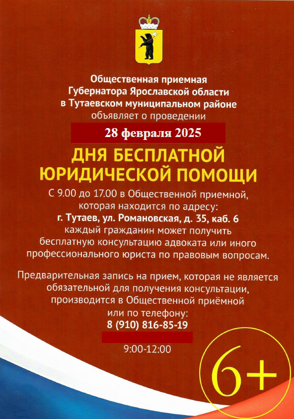 27.02.2025 в 11.00 в помещении Администрации Тутаевского МР (по адресу: г.Тутаев, ул.Романовская, д.35, кабинет №6) организован личный прием граждан